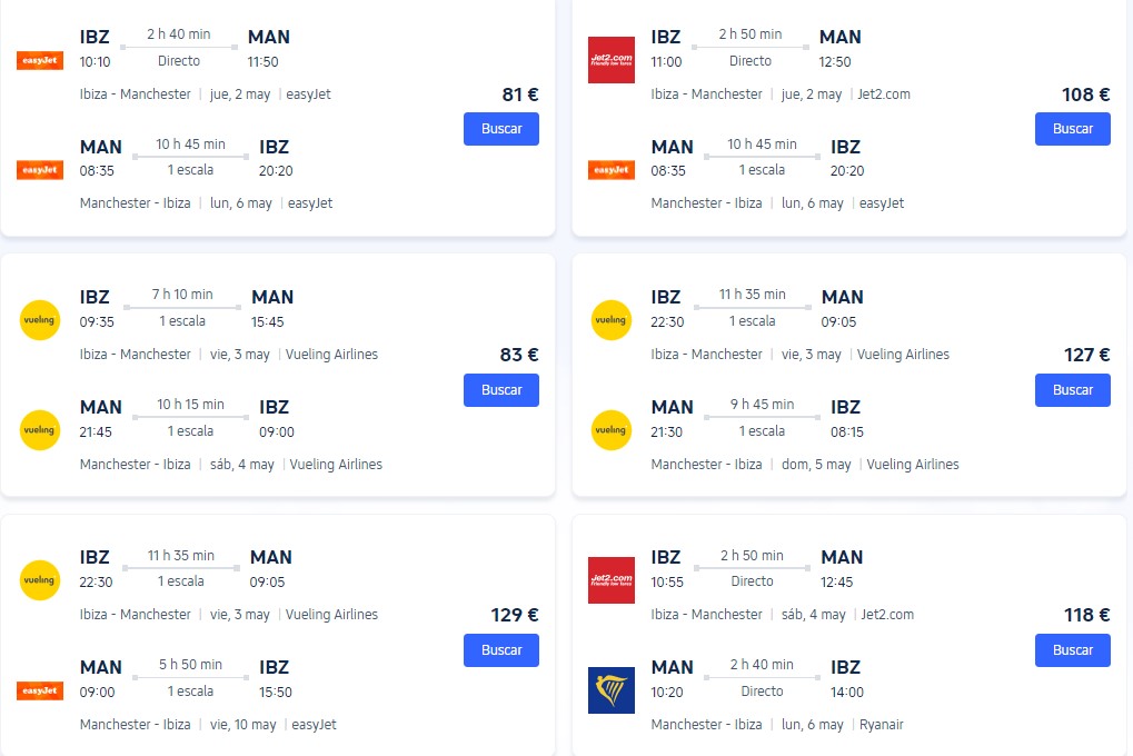 There are several airlines offering flights from Ibiza (IBZ) to Manchester (MAN), giving travellers a variety of options to choose from: